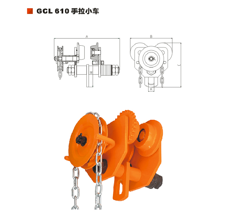 GCL-610手拉單軌小車系列小車選用了全新的高強度低合金結構鋼,確保4倍安全載荷,輕巧、安全、安裝方便、是目前較為輕巧小車之一。