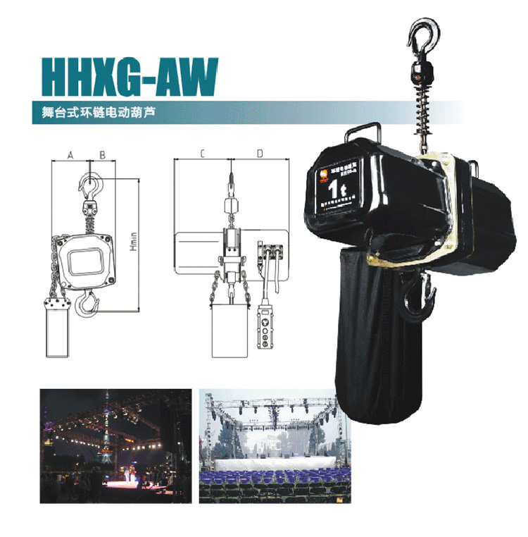 HHXG型舞臺環鏈電動葫蘆是一款高效低能耗的電動葫蘆。整機重量輕、結構緊湊合理,沖壓鋼構殼體,輕巧而堅固。HHXG型舞臺環鏈電動葫蘆專為舞臺電動鏈條吊車倒置或正常的位置而設計制造,舉凡舞臺音響/燈光/布景/鋼架用途廣泛。具有高可靠性,上、下都有極限開關裝置,微動開關反應速度短,能快速有效地止動,防止鏈條超出,確保安全。